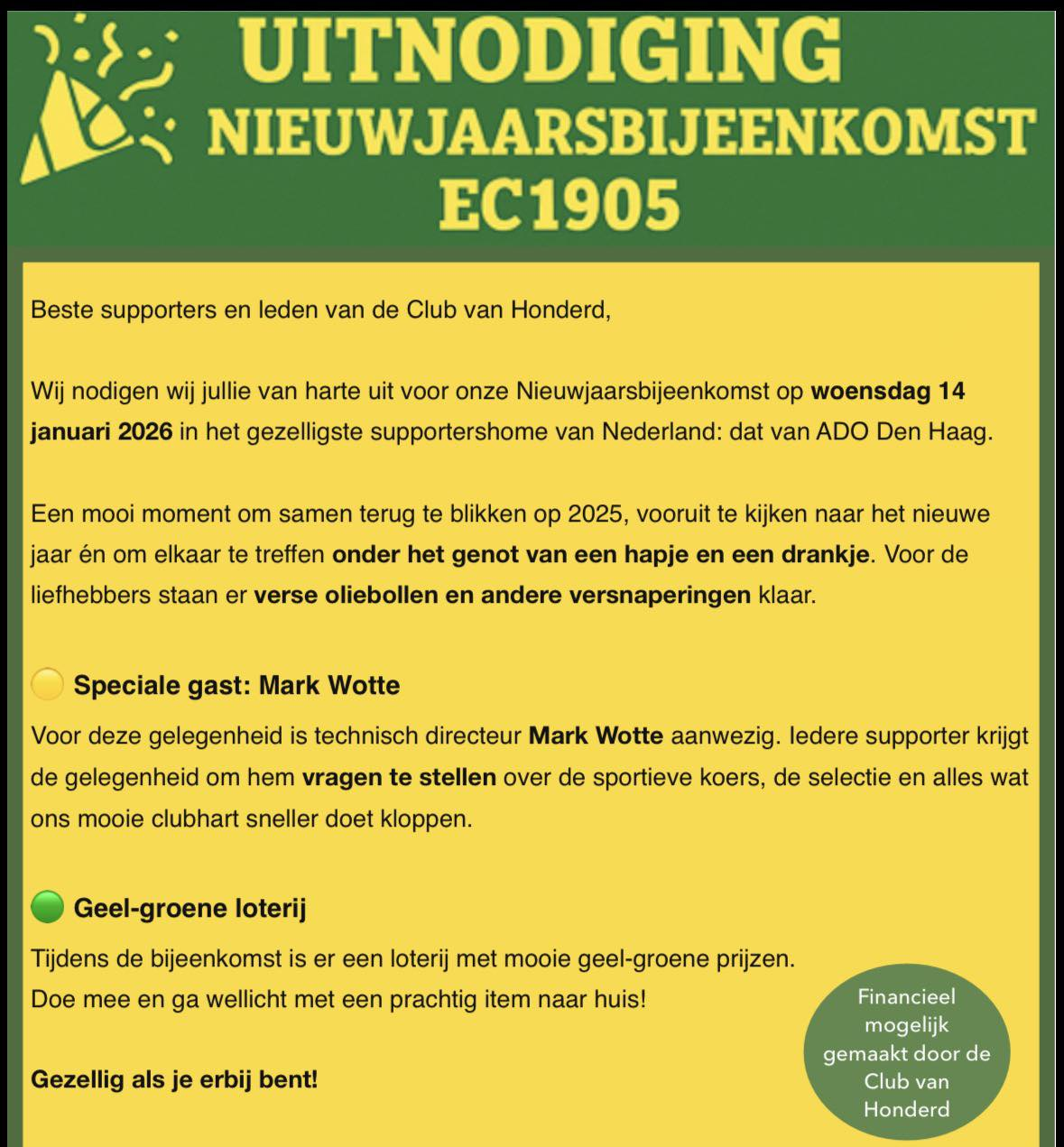 Hierbij nodigt de Evenementen Commissie 1905 jullie van harte uit voor de Nieuwjaarsbijeenkomst op woensdag 14 januari 2026 (aanvang 19.30 uur) in het gezelligste supportershome (geopend vanaf 19.00 uur) van Nederland: dat van FC Den Haag.